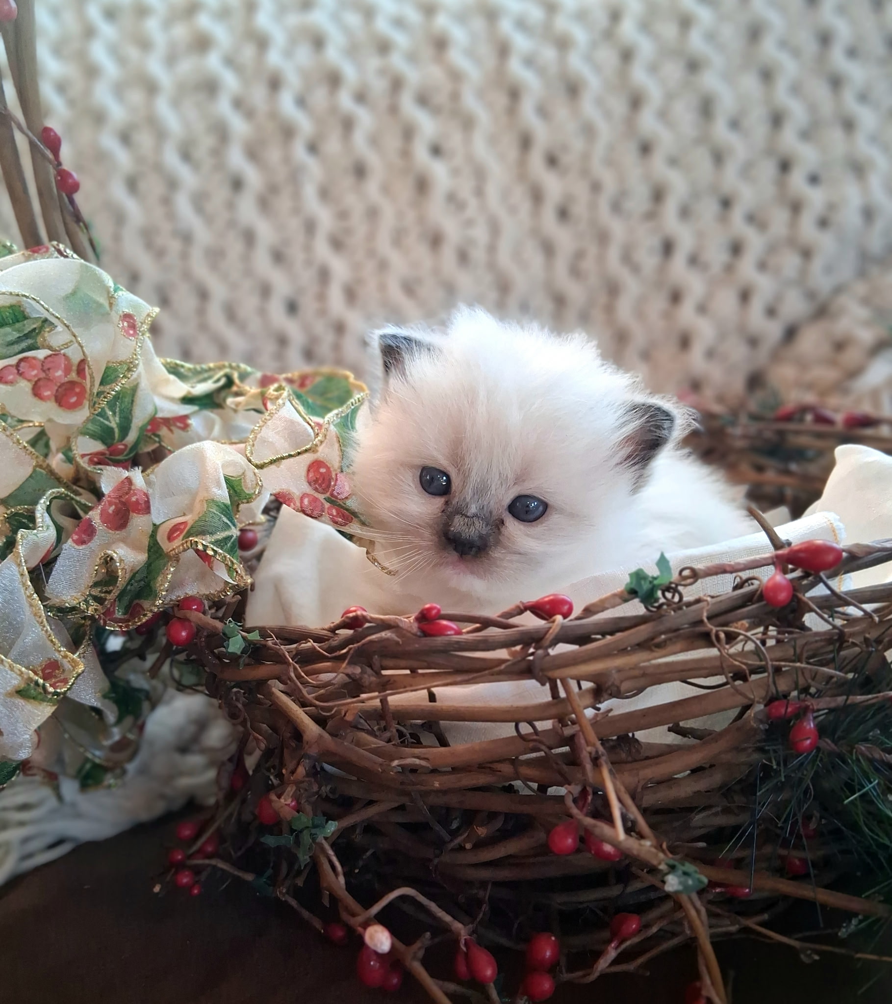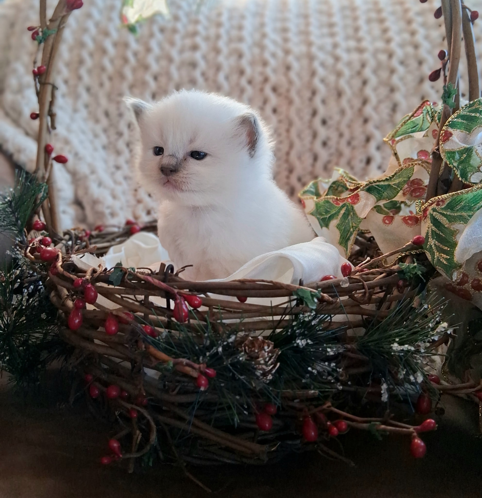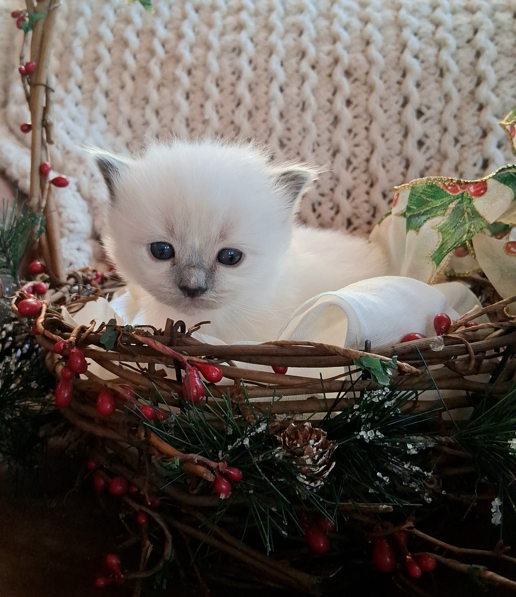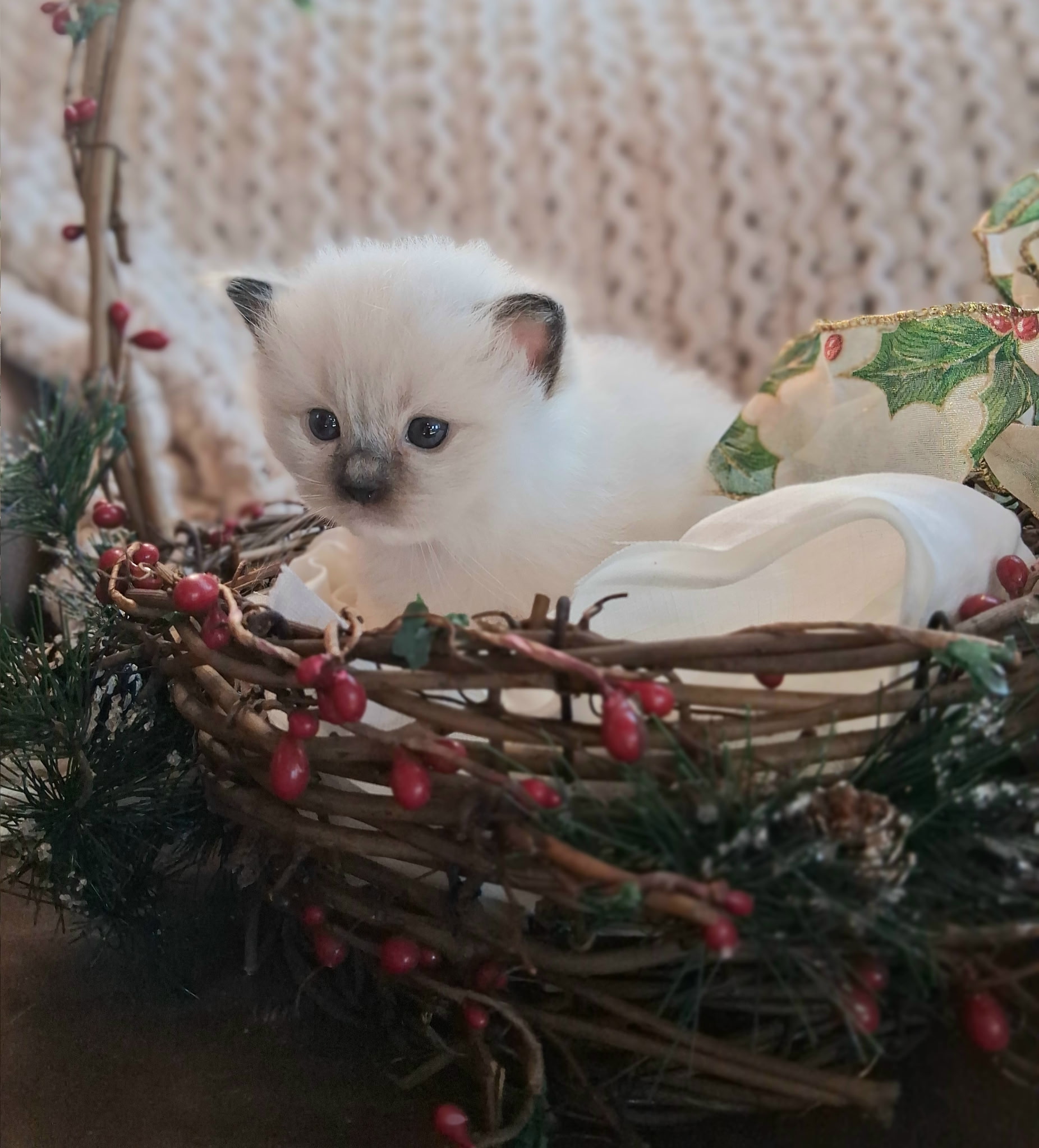Born Oct. 13, 2025. Male, mitted blue point like mommy. Very playful! Ready to adopt before Christmas.